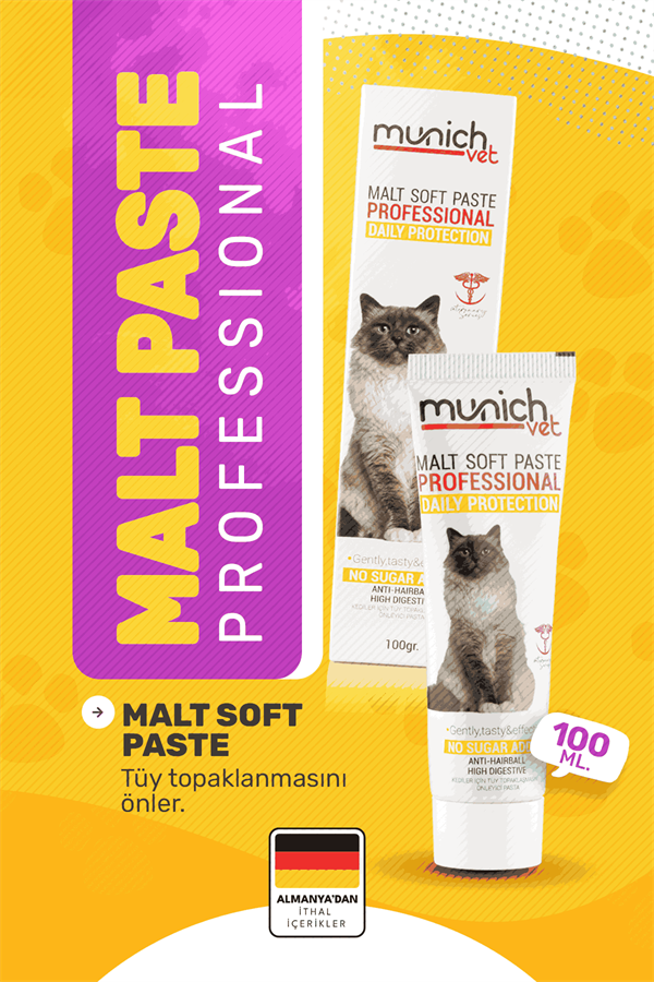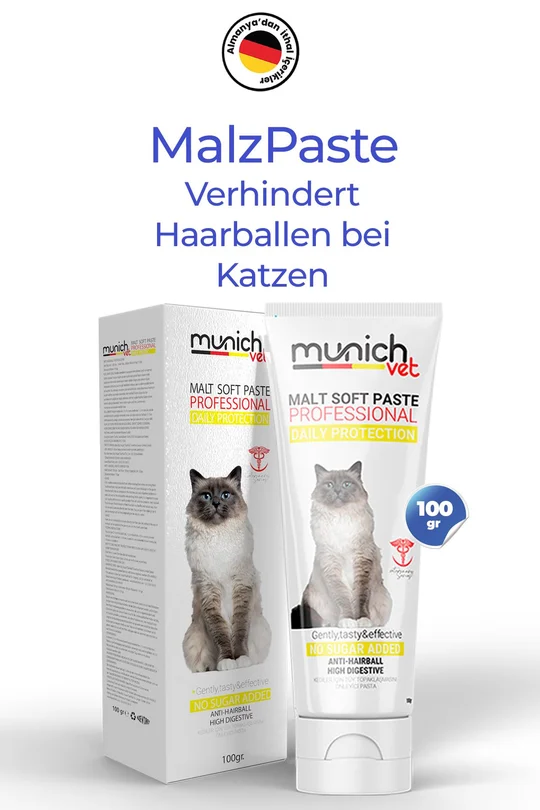 خمیر مالت نرم Munich Vet Malt Soft Paste از سری Professional، یک محصول تخصصی برای گربههاست که با ترکیبی از مالت باکیفیت و روغنهای گیاهی باعث میشود گربهها راحتتر با گلولههای مو در معده مقابله کنند و هضم بهبود یابد.