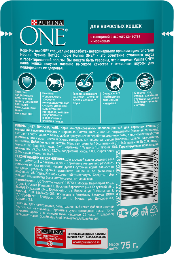 غذای مرطوب گوشت گاو و هویج PURINA ONE یک وعده کامل و خوشطعم برای گربههای بالغ است که توسط متخصصان تغذیه پورینا طراحی شده تا نیازهای انرژی و سلامت گربههای بالای 1 سال را بهطور کامل تأمین کند. این غذای مرطوب با قابلیت هضم بالا، ترکیبی دقیق از ریزمغذیها، پروتئین باکیفیت و مواد مغذی ضروری دارد که به افزایش انرژی، نشاط و تقویت سیستم ایمنی گربه کمک میکند.